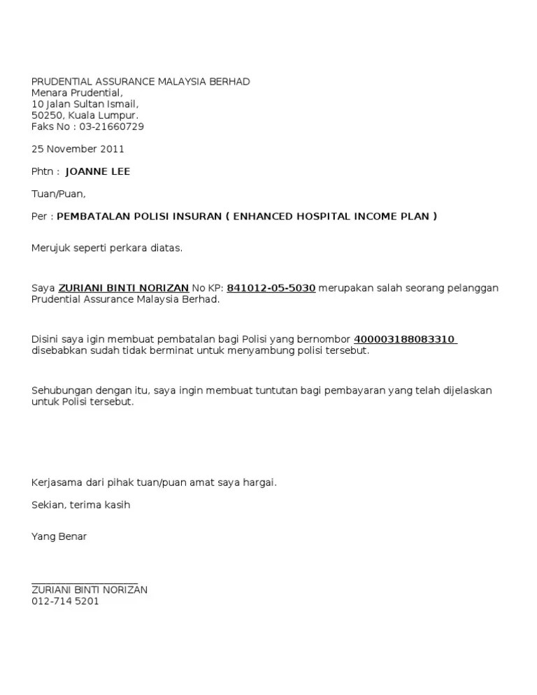 Contoh surat batal takaful bsn prudential . Contoh surat rasmi pembatalan insurans hellowinv.